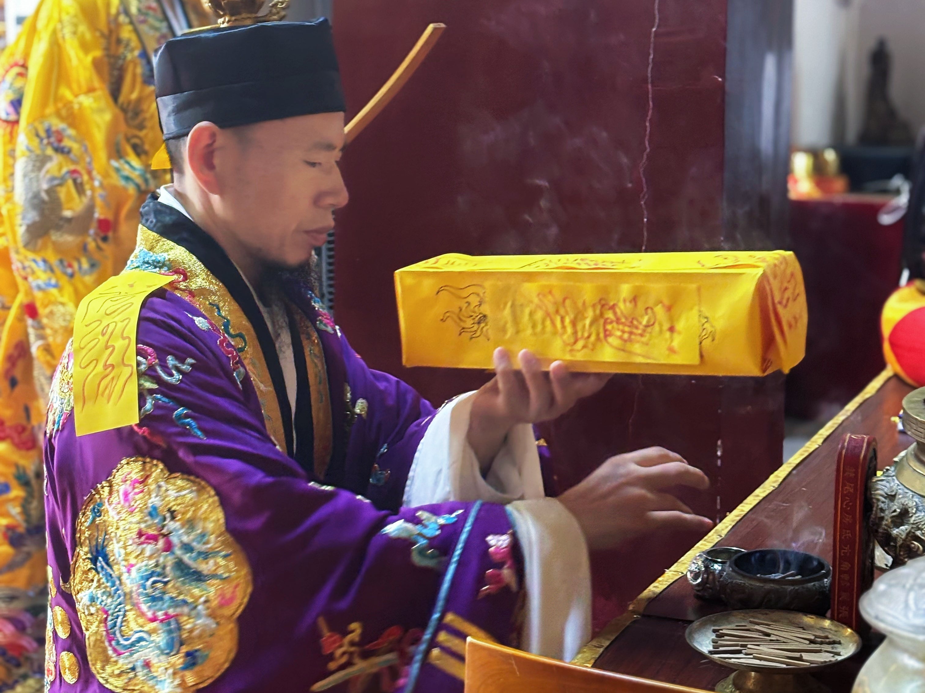 The ceremony is personally conducted by Wang Luohai, our purple robed grandmaster from Longhu Mountain. He will construct the sacred altar and perform the complete ritual according to the orthodox tradition, petitioning the High Deities to descend and grant blessings, avert calamities, and resolve misfortunes for all participants.