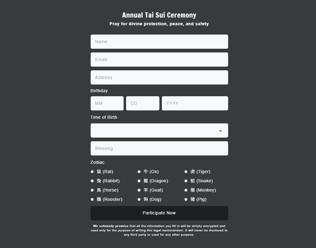 Your name and birth details are used only for inscribing the prayer petition. After the ceremony, all paper documents containing this information are ritually and properly incinerated according to tradition, ascending to the Celestial Court. All electronic data is also kept strictly confidential.