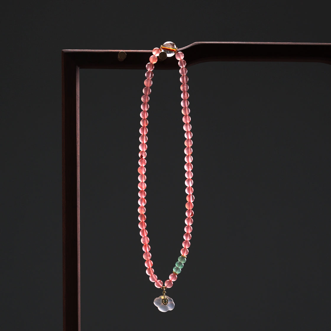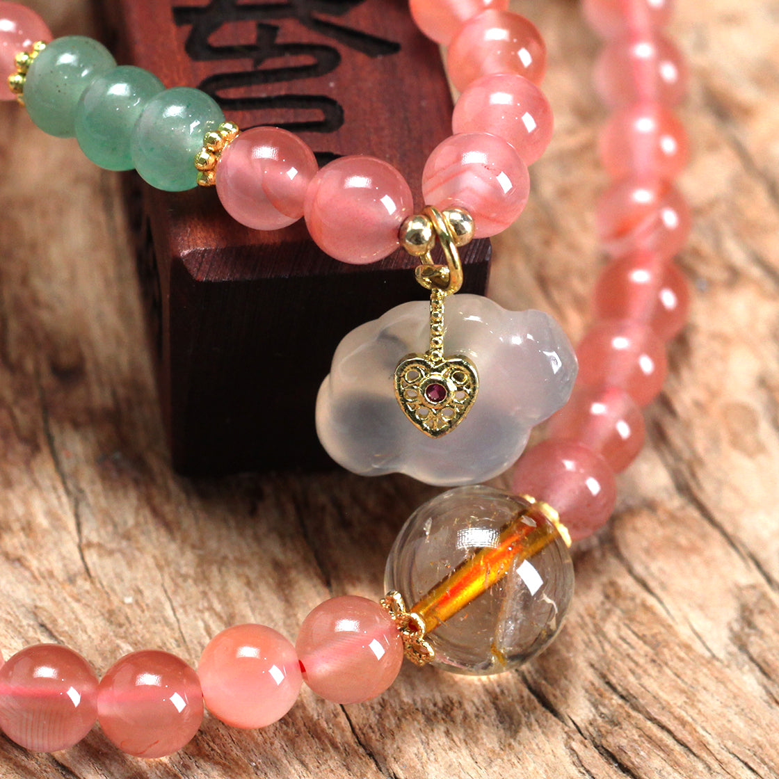 承龍虎山正一法脈千年道統,火五行的粉水晶主愛情與活力,以天然粉水晶爲核,契命理情絲,系桃花靈緣,粉晶色如春桃初綻,得大地鍾靈滋養,是“石中藏焰,情絲繞指”的靈物,充滿活力;串珠間綴翠玉靈秀,每一顆粉晶皆經山川氣脈浸潤,攜火性能量、桃花靈性,待君腕間啓緣。