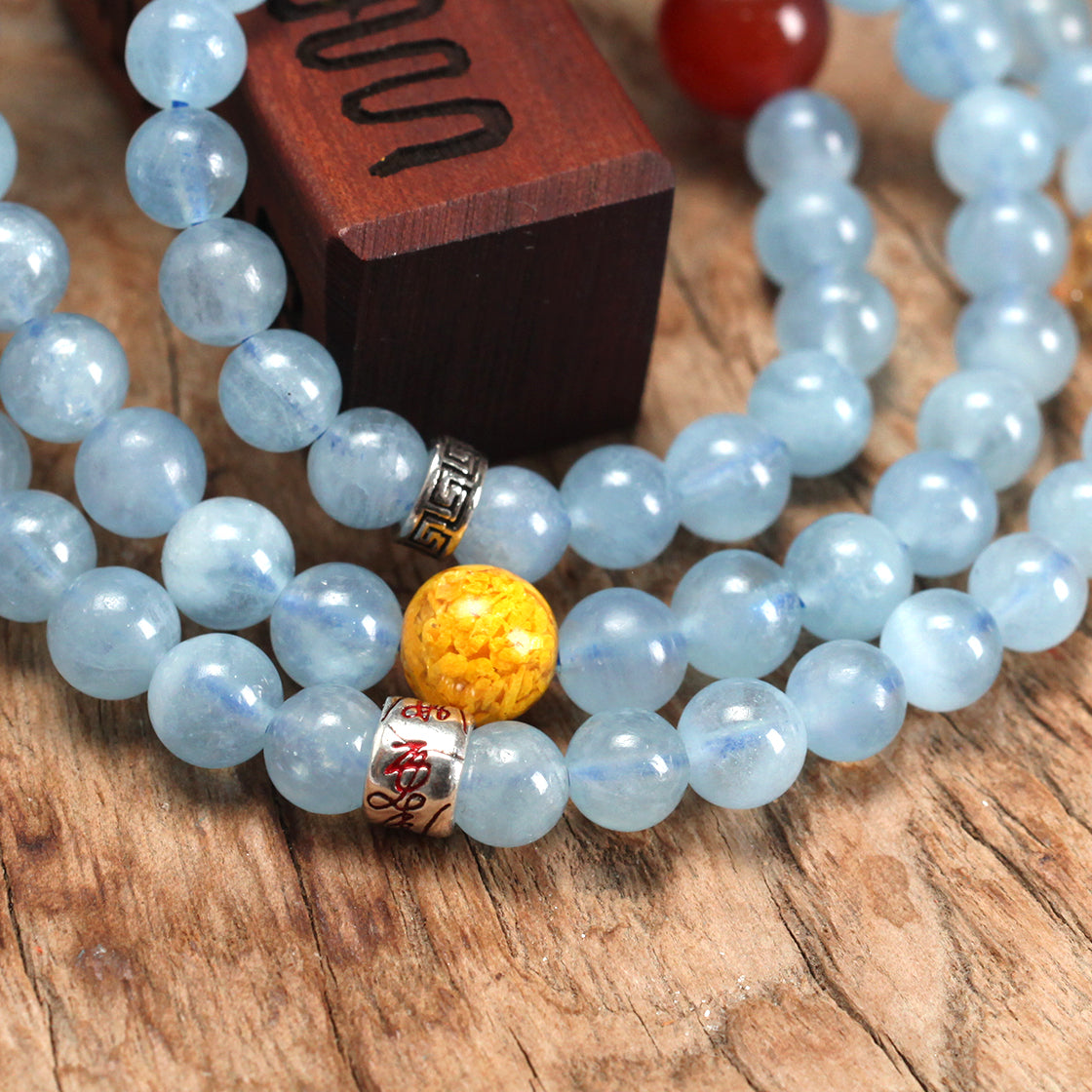 承龍虎山正一法脈千年道統,水五行的藍水晶主智慧與淨化,以天然藍水晶爲核心能量載體,融合道家太極八卦及誅煞符設計而成,藍水晶在道家稱爲“玄冥水精”,主智慧通達、淨化萬物。配珠鐫刻太極圖與八卦符文,象徵陰陽交融,萬物化生。誅煞符的銀飾更是點睛之筆,賦予了此串誅煞辟邪的護身功能。